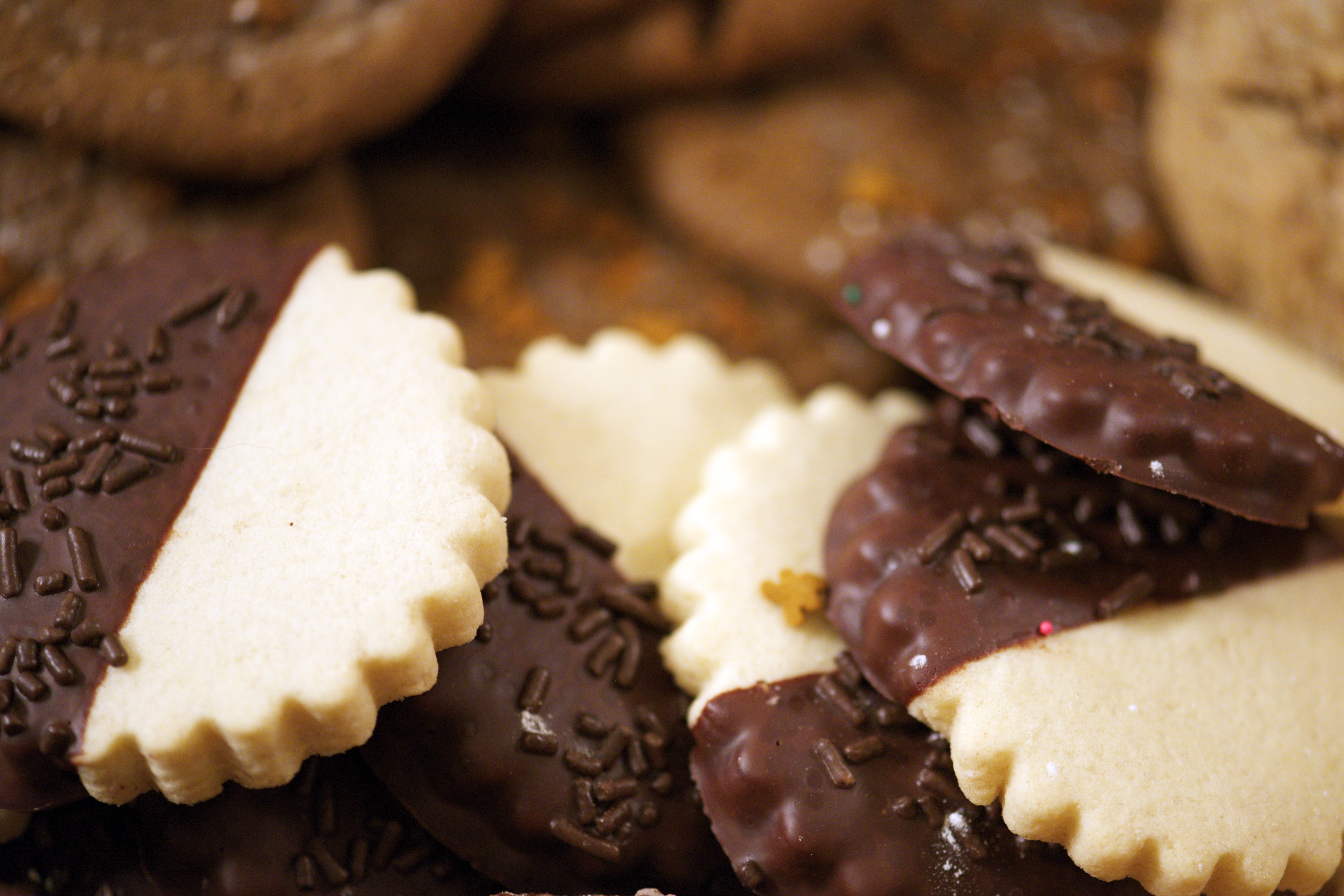 - Melt the chocolate in a double boiler. Dip the cookie halfway in melted chocolate. Place on a cookie sheet lined with parchment paper. Sprinkle with chocolate sprinkles and let cool.