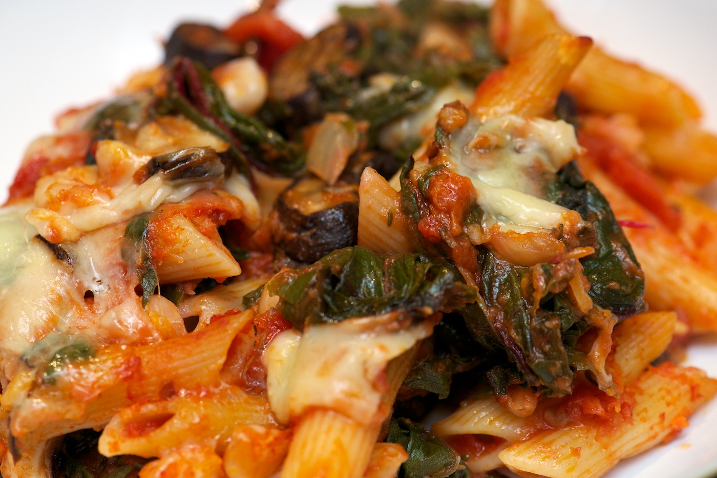 • In a large bowl, toss together the cooked penne, sauce, beans, mushrooms, and swiss chard.