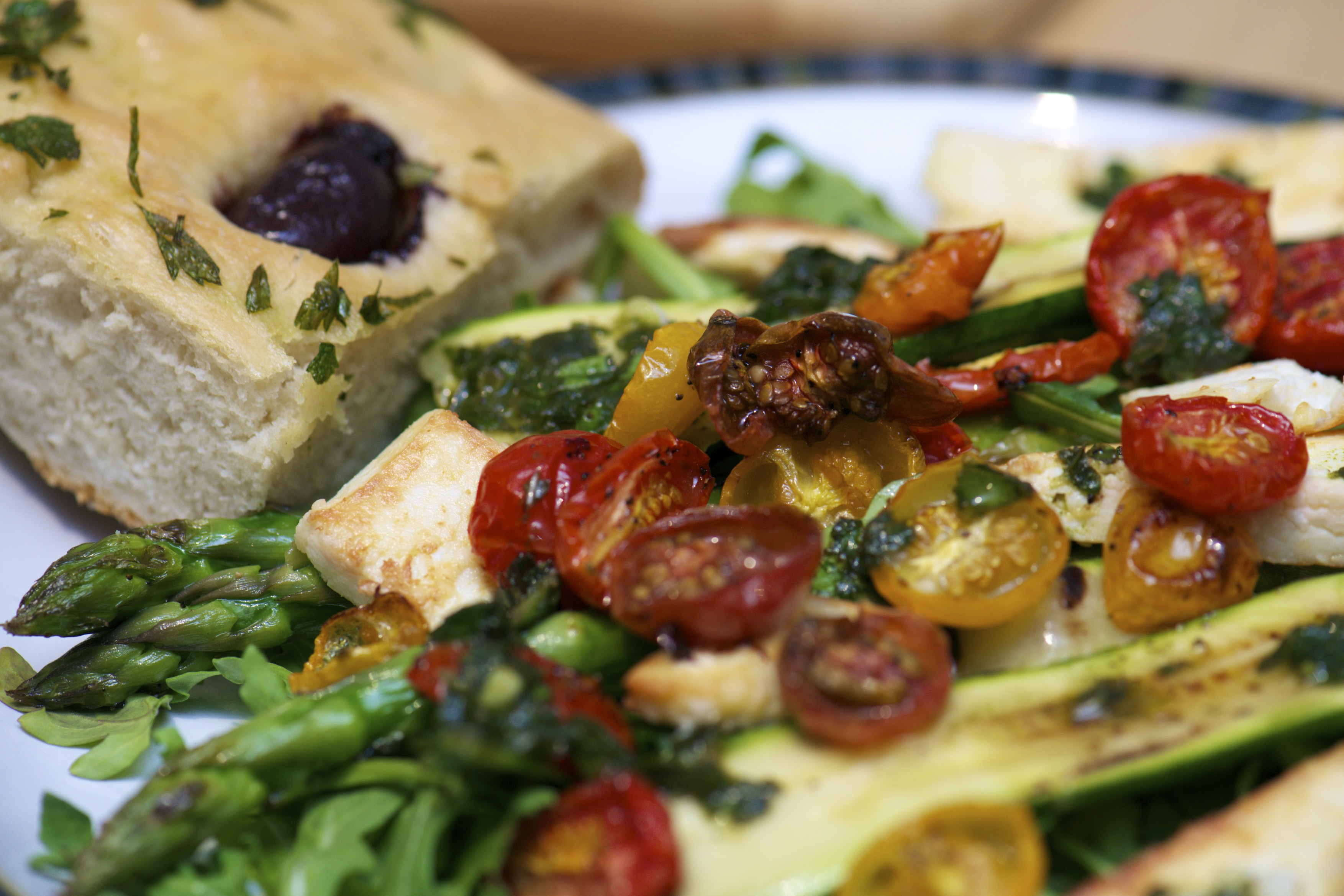 - To assemble, divide the arugula on 2 dishes. Top each plate with half the asparagus, zucchini, tomatoes and cheese. Drizzle each plate with the basil oil.